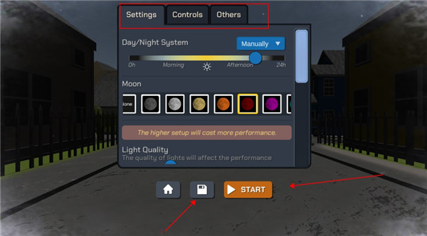 4、进入后会弹出一个设置,我们可以在此设置月亮颜色、地图日间夜间的时间、控制的灵敏度、还有烟花发射保障产生的振动等等,当我们设置好后,还可以点击下面的存储按键,保存下来,这样后面就不同再次手动调整了