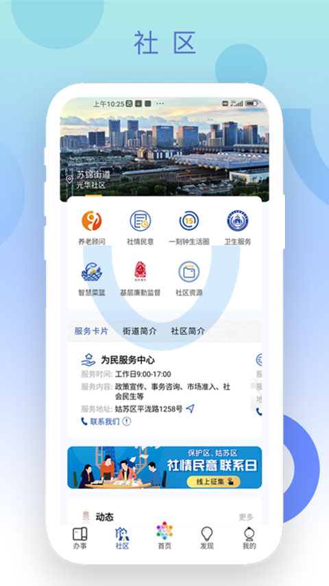 4、社情民意:居民可在“社情民意”模块提交诉求、在线预约,并接收反馈答复。