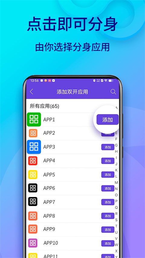 应用多开分身功能,完美支持微信多开、QQ多开、抖音多开、美团多开、企业微信多开、PUBG等游戏多开等绝大多数应用无限分身多开,依托独立内存管理机制,手机无限分身不卡顿、不闪退。