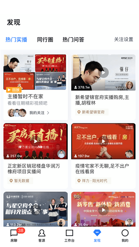 6、拥有热门的直播可以观看,还能切换直接查看房地产行业的同行圈。