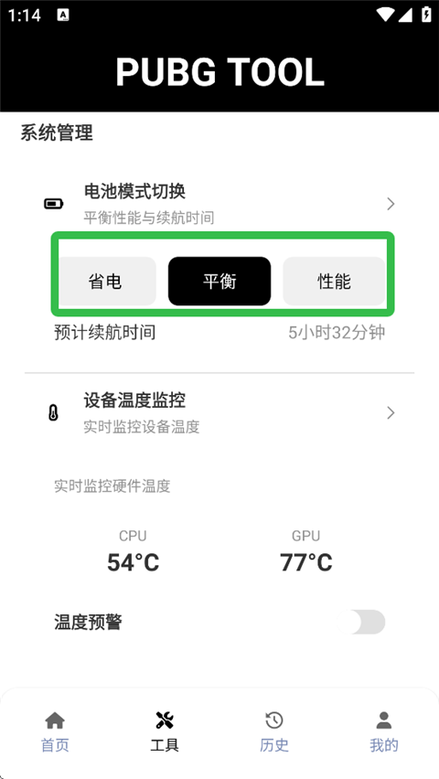 5、而【系统管理】则可以让玩家实时看到设备控件温度,以及进行电池模式的切换。
