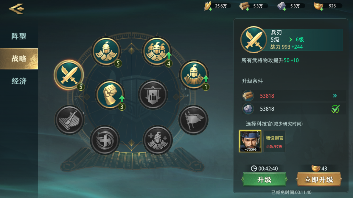 攻击类的科技选择一个升级就行,前期没那么多资源的,主要升级物防和物攻科技。防御科技稍微点一点就行。兵力科技也挺重要的,别忘了升级,阵型选择1个或2个重点升级就行。