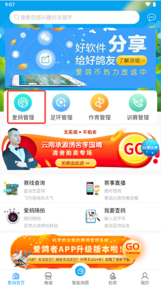 1、首先找到首页中的【爱鸽管理】;