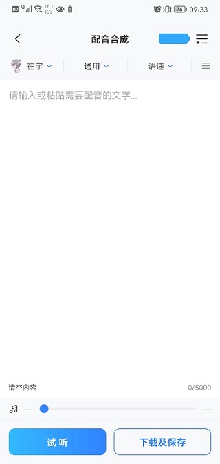 3、输入需要配音的文字,在该页上方你能选择配音的声音,情绪以及语速