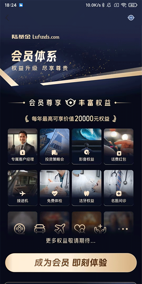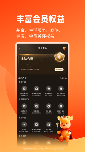 5、丰富会员权益,基金、生活服务、商旅健康、会员关怀权益。