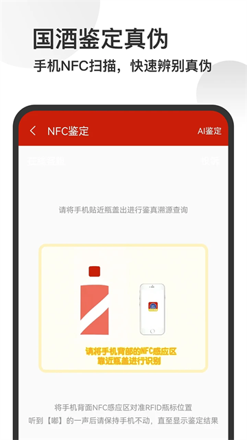 茅台镇国酒NFC溯源鉴定是一款国酒防伪溯源软件,汇集全国海量流通商品的重码、错码等信息,能够有效的帮助你快速识别假货,还可通过比对原厂数据比对三码合一,防止套瓶,鉴定完成后可快速精准的生成真假鉴定报告。软件采用全新RFID防伪技术,能够有效降低用户购买到假货的概率,防止用户因此造成人身财产损失,使用时用户仅需用带有手机NFC贴近RFID瓶标位置即可,听到“滴”的一声,停留片刻即可快速验证真伪,流程便捷,且识别率较高。同时,茅台镇国酒NFC溯源鉴定App里面还有国酒抢购飞天茅台预约服务,能够帮助你更便捷的进行购酒服务,有需要的用户快来本站下载开始使用吧。