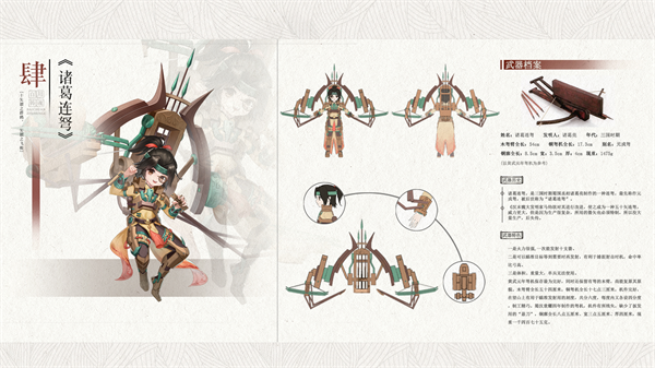 诸葛连弩一次能发射十支箭,火力很强,但是体积、重量偏大,单兵无法使用,主要用来防守城池和营塞。