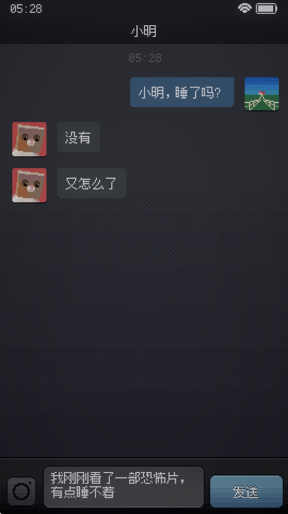 Can'tSleep是一款挺有意思的恐怖视觉小说游戏,你扮演一个刚看完恐怖片不敢睡觉的女孩,得通过和虚拟好友小明聊天来推进剧情。游戏模仿真实聊天界面,还能用AR拍照解锁各种恐怖细节,但拍的时候要小心,可能会捕捉到意想不到的诡异东西!我玩了一点,感觉挺有心理压力的,尤其是那些细思极恐的设定,比如会动的大象玩偶和像盘子一样的灯,真的让人毛骨悚然。