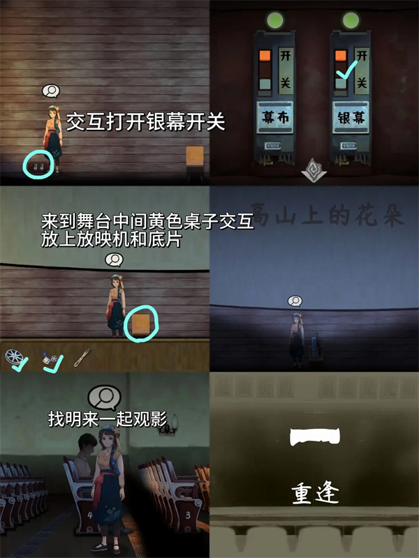 12、打开银幕开关,在舞台中间黄桌放放映机和底片,找明来一起观影,迎来“重逢”结局