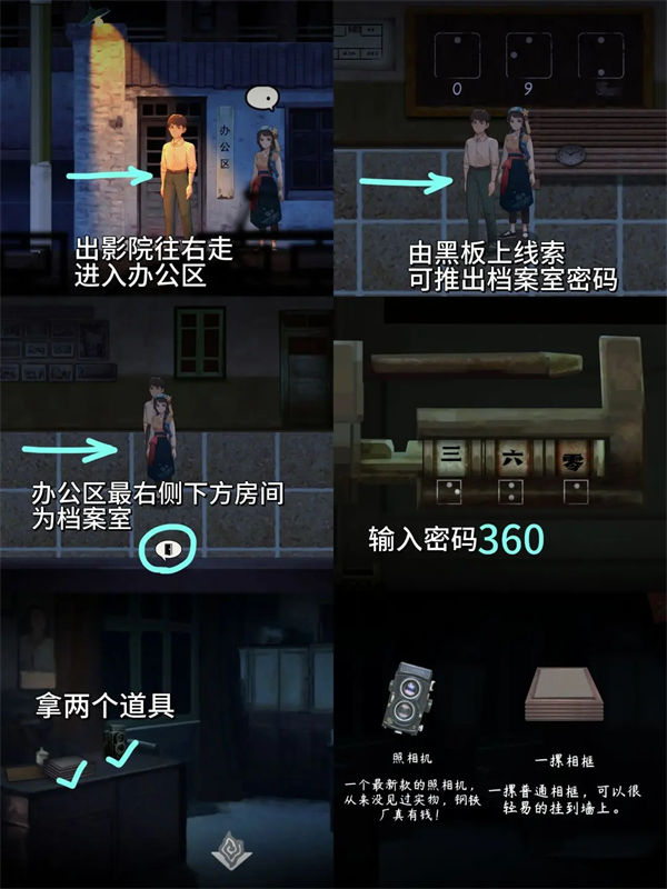 4、出影院进办公区,借黑板线索解档案室密码,获取相机和相框道具