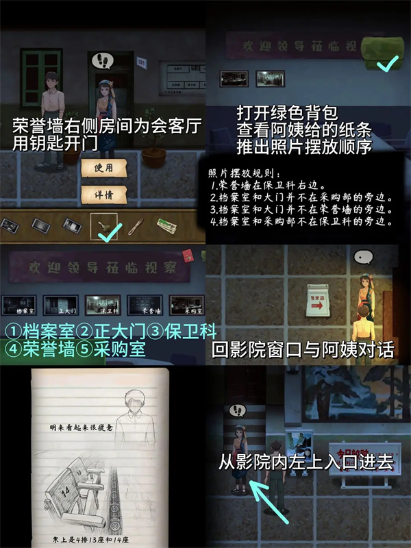 8、用钥匙开客厅门,借纸条推理照片摆放,回影院对话后从特定入口进入