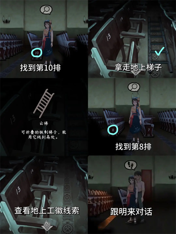 10、在影院找特定排数,拿梯子、查工徽线索,最后与明来对话推进剧情