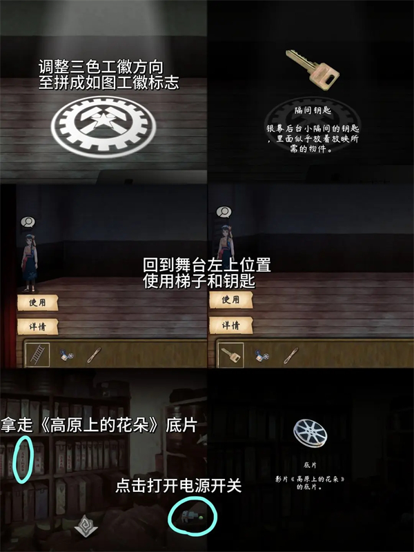11、调整三色工徽拼成标志,用梯子和钥匙在舞台左上位置操作,拿走《高原上的花朵》底片并打开电源开关