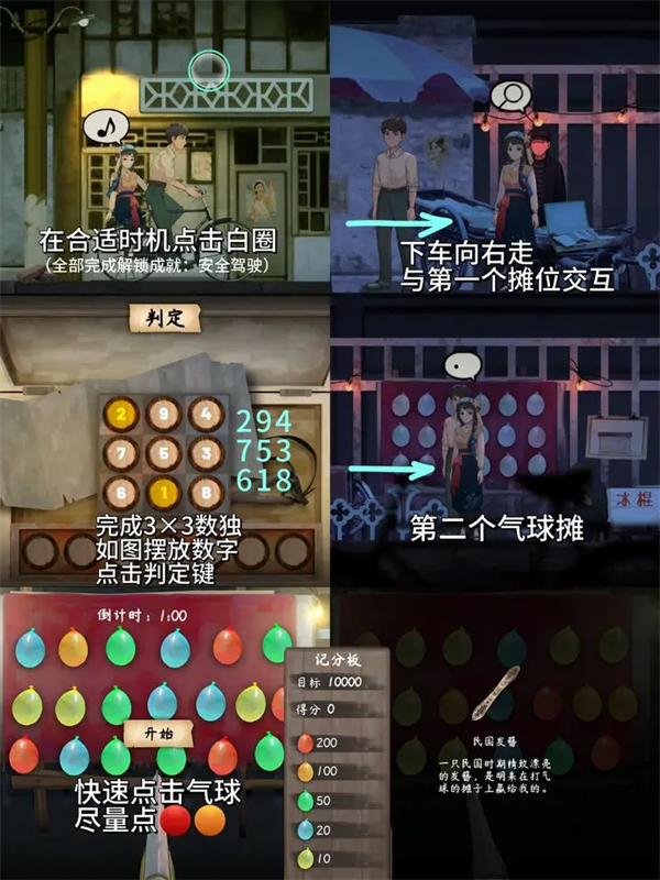 游戏背景设定在一座边境小城,故事围绕着段漓芳和她的丈夫展开。他们的浪漫约会意外成为了一场惊悚的冒险,途中涉及打气球、数独、万花筒等多种小游戏,让玩家在解谜的同时体验多样化的互动乐趣。谜题难度适中,适合喜欢剧情驱动和悬疑挑战的玩家。