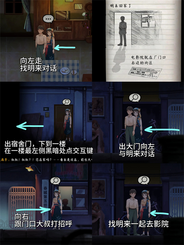 1、引导与明来互动、完成宿舍及厂区外一系列对话和行动,准备前往影院