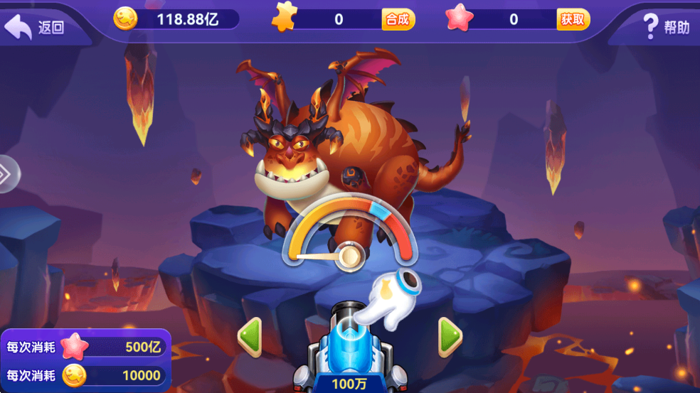 打怪兽玩法也很有意思,按住屏幕转指针,松手发射子弹,指针指向黄色区域能获得少量碎片,蓝色区域则是大量碎片。调整炮台倍率也能影响碎片数量,不过倍率越高金币消耗也越多。这些碎片可以用来合成游戏物品,设计挺合理的。