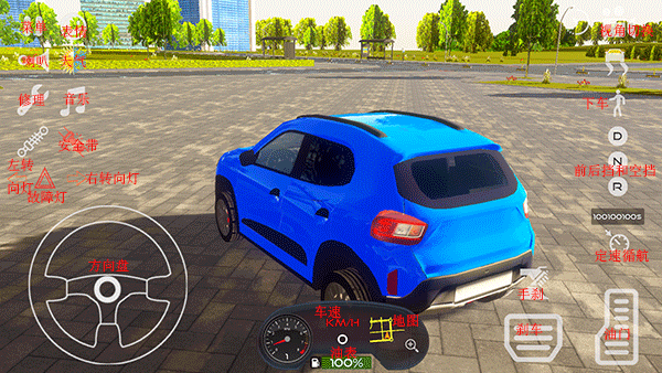 3、点击play开始游戏,左上角分别是喇叭、天气选择、修理车辆、播放音乐、安全带、左转向灯和右转向灯、故障灯,左下角是车辆方向盘,底部中间是油表和时速表还有地图,右边是从上到下分别是视角切换、下车、前进档、空挡、倒车档、定数巡航、手刹、刹车和油门。