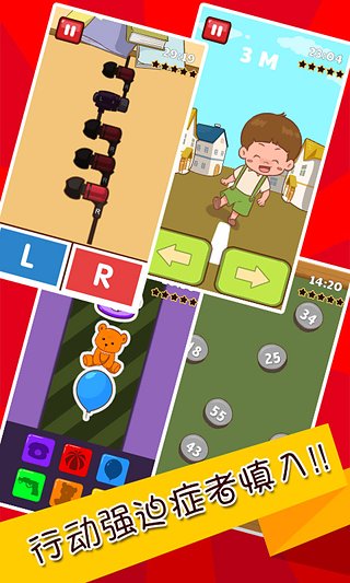 史上最难强迫症就这样诞生了~!这是一系列有趣的、经典的敏捷类游戏合集,该游戏以卡通风格的画面带给玩家十足的游戏乐趣,游戏中每个关卡都是非常让人揪心的,各种左右手并用的关卡让你大脑随时死机,而且必须重新来过,玩法简单的同时挑战确实拉满的!不过这些挑战主要就是针对强迫症,如没有对齐的井盖、颜色不一的糖果、没有归好类的玩具、总是洗不干净的双手、门有没有锁紧、袜子没穿一样,治愈性非常的强。除此之外,史上最难强迫症还有不同的关卡,每个关卡都有不同的通关技巧,玩家需要认真的找到方法,然后摸出其中的规律,非常的让人上瘾。
