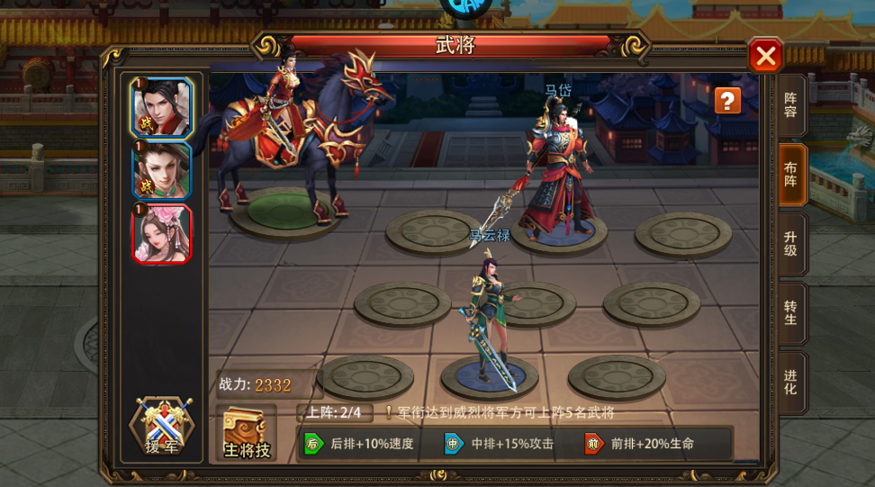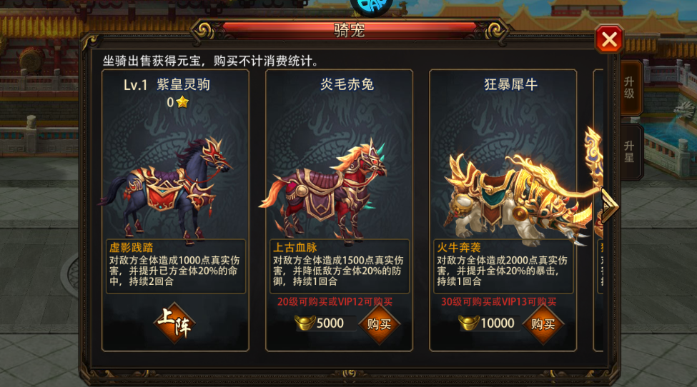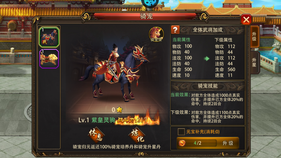 3.培养骑宠能给全体武将带来更多的属性加成,培养骑宠包括提升骑宠等级和星级
