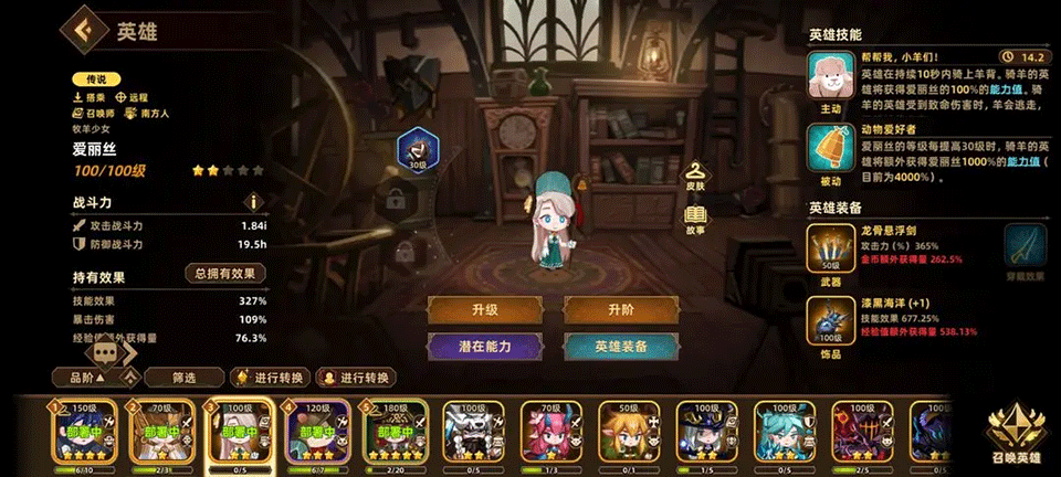 6、当爱丽丝升至1星后,打BOSS和推图的输出位可使用“双技能加成装备”,收益更高,无需堆纯攻击。
