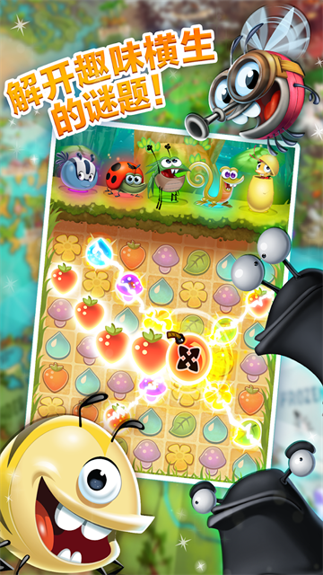 呆萌小怪物官方正版是一款非常好玩的卡通动漫题材点击消除休闲益智类游戏,融合了《愤怒的小鸟》和《Candy Crush》元素的成瘾之作,将《Candy Crush》的益智风格与RPG元素结合在了一起!游戏主角是一只蚊子,玩家需要帮助主角小虫虫快速的点击消除相同属性的图案,注意如果消除的属性上面拥有虫虫,消除到一定的数量之后,就能够生产特殊的道具喔。同时呆萌小怪物游戏的画面清新亮丽,角色设定可爱,关卡和音乐也都是由著名的专业人士设计。