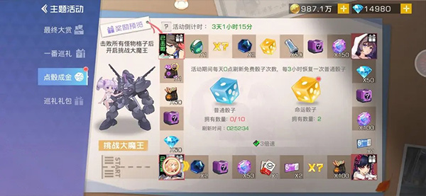 唯一要注意的就是拿50钻买一颗金骰子,离金骰子<6步数的时候用金骰子固定到金骰子那格,拿两个,离扭蛋券<6同理,可以无限白嫖。大奖优先选择红精灵碎片(异界幻梦)。