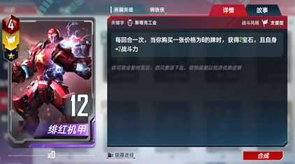 斯塔克工业的卡牌收益大多数来自于打出,但是之后的回合里失去打出效果的卡牌的战斗力可能就会下降。那这些卡牌就可以卖掉来换取一些收益,就像很多机械一样报废了可以折旧变现。同时斯塔克工业也设计了一些卡牌专门用来可以获得宝石,就像钢铁侠作品中呈现的那样,斯塔克工业是一个财大气粗的财团,财富可以换来更高的战斗力。