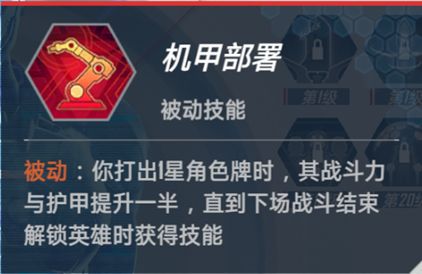 机甲部署:被动,你打出1星角色牌时,其战斗力与护甲提升一半,直到下场战斗结束。