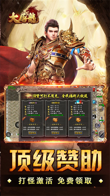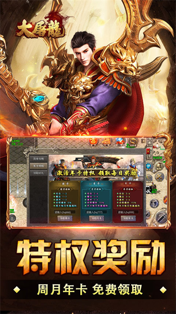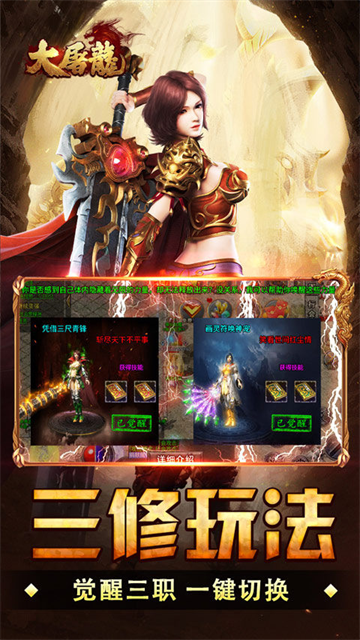 大屠龙(战法道三修送年卡) 是一款超变单职业传奇手游!上线纵横驰骋套装、十步一杀、擒龙手、冰霜群雨!自动回收、自动拾取,轻松解放双手!超多大陆、超多内容,等你来尽情探索!刷怪即可获取礼包币,礼包疯狂买买买!