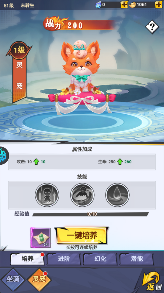 4、当灵宠培养至对应等级时可激活或升级培养技能。