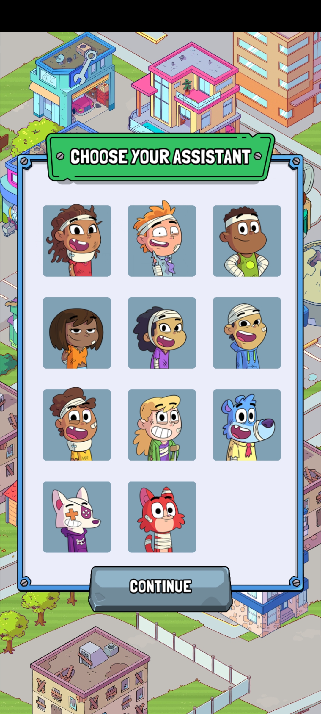 1、开局选择你的助手,点击continue继续