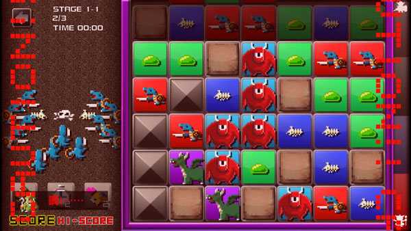游戏目的就是消除3个以上相连的方块,召唤方块中的魔物去攻击左方的勇者。全部共有三人,分别是杂鱼、经验多or稀有(机率性)、BOSS