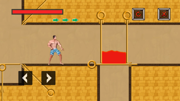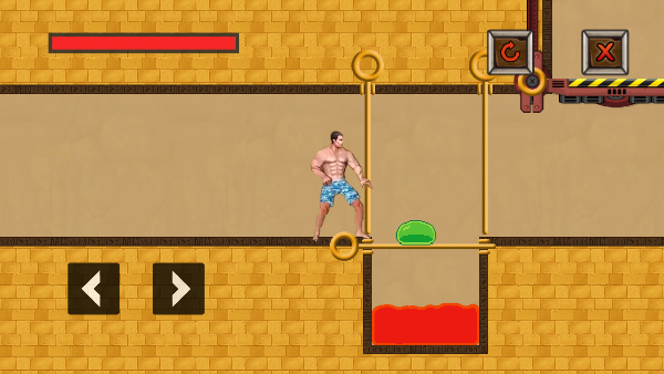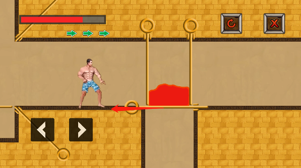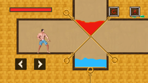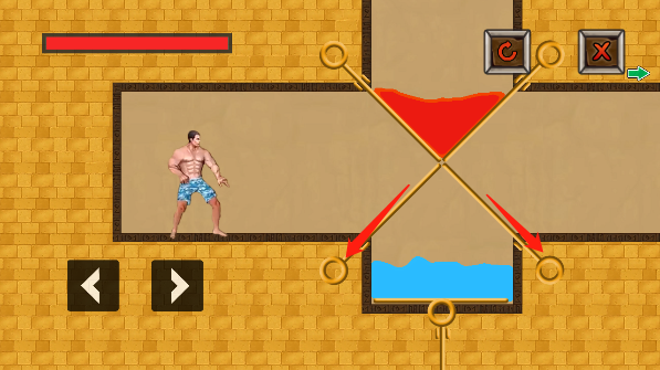 初次进入关卡,我们首先将水池上方的拉环向下抽,再将上方拉环抽出,让岩浆与水池融合并抵消