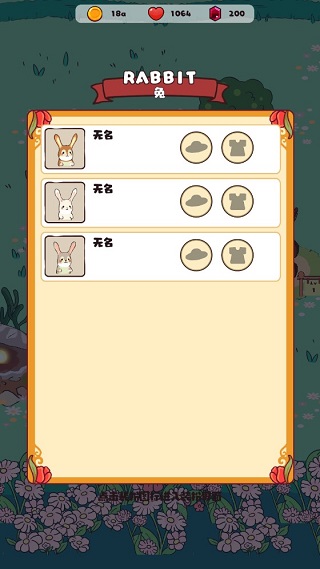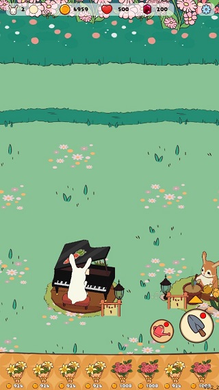 在森林的一处,玩家需解锁各式各样乐器,吸引可爱的兔子来演凑,给兔子添置休闲设施,帮助兔子种出更多的花,还能给兔兔装扮和布置房间,同时不要忘了给兔兔们种菜哦~