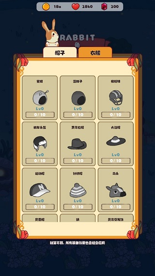 点击图中的帽子或衣服图标可以具体进行到服装搭配界面,如图所示,为兔子们装扮新衣不仅形象上看上去会更加美观,而且不同的装备效果即使不戴也会组合应用,大幅提升的挂机效益,让森林音乐会舞台变得更加华丽。