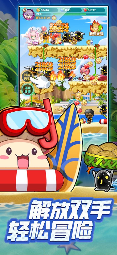 1、轻松挂机+自动战斗的机制让冒险家们随玩随停,无论是上班途中亦或是闲暇休憩时都能单手轻松游玩。