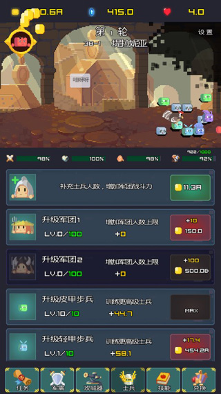 关于这款游戏简单的操作玩法需要玩家不停的升级和点击任务,期间所斩获的大量金币可用于升级军需、士兵攻击和士兵数量,提升战斗力,使得攻城拔寨更加迅速;爱心可用于升级攻城器,增加攻城效率;钻石可用于升级技能,增加英雄输出和战略补给。