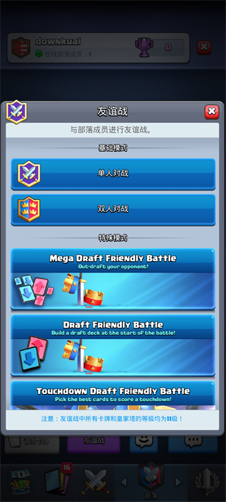 与部落成员进行友谊赛,支持单人、双人及特殊模式对战通过友谊赛,玩家可以磨练技巧,测试卡组搭配,同时增强部落成员之间的互动与合作