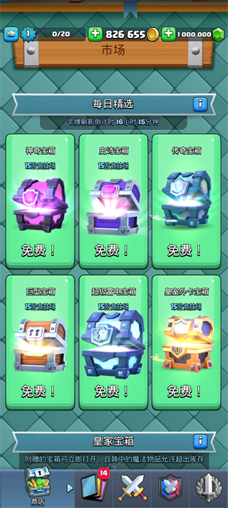 市场提供每日精选和皇家宝箱等福利,玩家可以免费领取并开出各种道具和奖励,提升游戏体验和战力