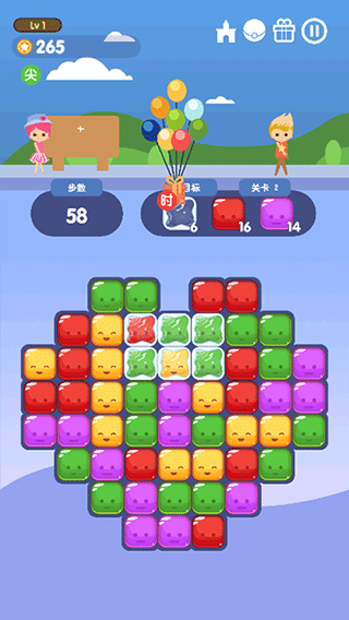 1、玩家只需要将两个或两个以上相同颜色的方块进行消除,就可以将任务完成进入到下一个关卡。