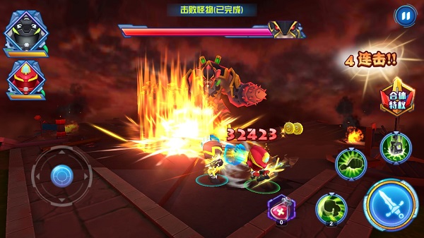 巨神战击队3是由成都雷兽互动诚意打造的一款3D角色动作类手游,游戏改编自国产超人气动画《巨神战击队》,相信不少玩家或多或少的都看到过类似的特效影剧,在这里“鼠王爷”将带领它的四大妖君再次祸害人间,而你作为新一代巨神将的继承者,需联手其他红宵卫、黄擎卫等其他四名主角一起战斗,粉碎“鼠王爷”制造了各种自然灾害及社会公共灾难。视觉上,该游戏画面品质极高,里面不仅拥有许多丰富精美的场景,还有极其炫酷的技能特效展示,火山、城市、沙漠等许多场景,都采用了全3D引擎打造,这样便大大增强了玩家亲临现场的既视感;同样巨神战击队3在玩法方面,海量关卡的精妙设计,既有新鲜的探索欲望,也有无穷战斗的爽快动作体验,不在一味的枯燥刷怪,而是依托剧情,完成指定关卡目标,但别忽视了游戏关卡中的陷阱和机关哦,善加利用,可以大幅提升通关时间。另外,如果你拥有多名角色,那么可以选择两名角色同时出战,如此一来,战斗过程必然不再孤单,如果你还觉得不够,那么尝试为每名角色准备一双独一无二的翅膀,顷刻间,便能让你的角色拥有更炫酷的造型,临空作战,傲视全场。
