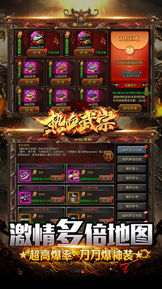 热血武宗是一款经典传奇全新高攻速高爆率版本手游,游戏上线送SVIP1直升卡16888绑定灵符,300w元宝,神兽白虎*1,登录免费送全神器,上线即拥有400%满攻速及200%移动速度!超高爆率刀刀爆光柱,神装神器全能爆,海量道具灵符回收,专属打金系统,仅需打怪即可获得打金点进行免费充值,还有内置0.1折代金券,仅需1元即可抵扣100元充值!如果你是传奇游戏的忠实粉丝,那么千万不要错过热血武宗消除版哦~