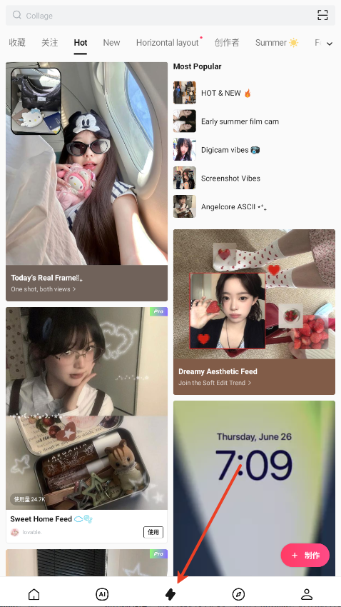 6、在主页面中间栏的创作按钮,可进入灵感专区,大家可以在这里找到拍照、p图攻略、灵感。