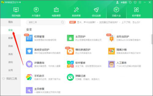 2、进入功能大全界面后,在左侧导航窗口找到安全,并点击。