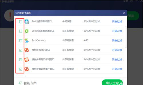 5、打开弹窗过滤器窗口,其中列出了能拦截弹窗的软件软件列表,点击勾选要拦截弹窗的软件。