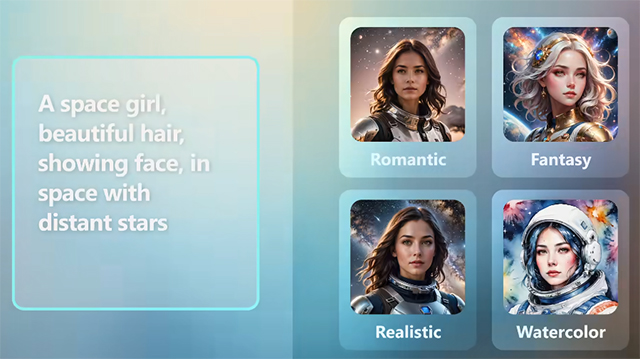 透过文字生成出视觉效果满分的图片。您还可以自行上传脸部参考图片,以生成出有类似脸部特征的人物,创造独一无二的 AI 图片。