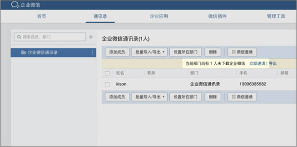 如果你的企业已有全员通讯录,你可以在企业微信导入通讯录后,一键发送微信、邮件和短信邀请。