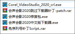 1、下载解压,得到会声会影2020简体中文永久版、补丁、修复工具,以及跳过下载器补丁;