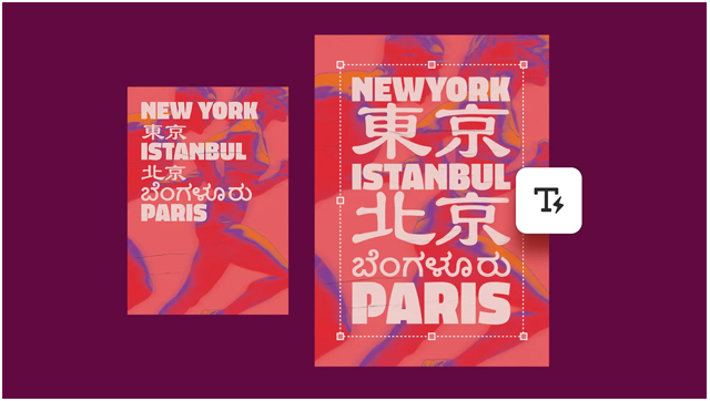 使用“动态文字”功能,以更少的步骤建立文字版面,并更快地尝试多个选项;该功能可在您调整其边界形状时自动调整至最适大小。