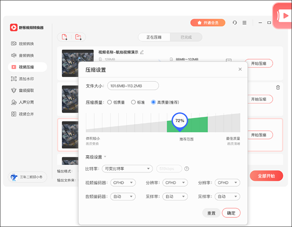 3、视频压缩:采用影视级压缩技术,大幅缩小文件大小,支持批量和自定义压缩。